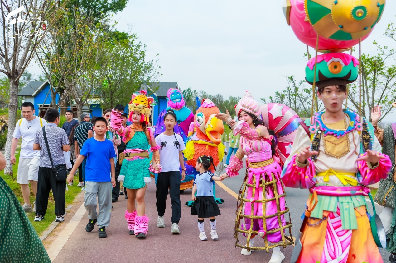 当天最受瞩目的当属童话主题巡游。灵山生态文化旅游区邀请荣获6次魔术奥斯卡“梅林奖”、受邀参加乌镇戏剧节的专业表演团队,“爱丽丝奇幻之旅”与“阿拉丁的美食愿望”两大主题巡游精彩上演,穿着童话服饰的演员们踩着欢快节奏巡游,孩子们追着队伍奔跑,举着气球喊“再跳一支舞”,稚嫩的笑声在山野间回荡。“演员都打扮得很美也很热情,会和大家互动玩游戏,孩子玩得特别开心,感觉真的进入了郊野童话世界。”带着家人前来游玩的市民王女士兴奋地表示。